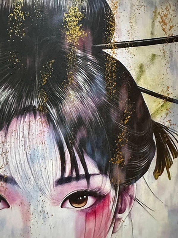 Er weerklinkt iets van Japanse mystiek in haar aanwezigheid, als een echo van Mono no Aware: het stille besef dat alles verandert en verdwijnt – dat schoonheid juist raakt omdat ze niet blijft. Haar tranen tonen een zacht, maar ook voorbij verdriet: een soort mildheid tegenover het leven zoals het is. De rode sporen op haar wangen zijn uitgeveegd als penseelstreken. Ze tonen een bitterzoete afdruk die de vergankelijkheid van het leven erkent.