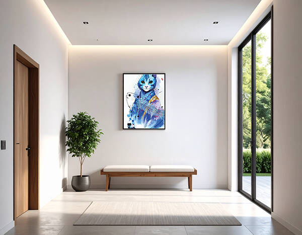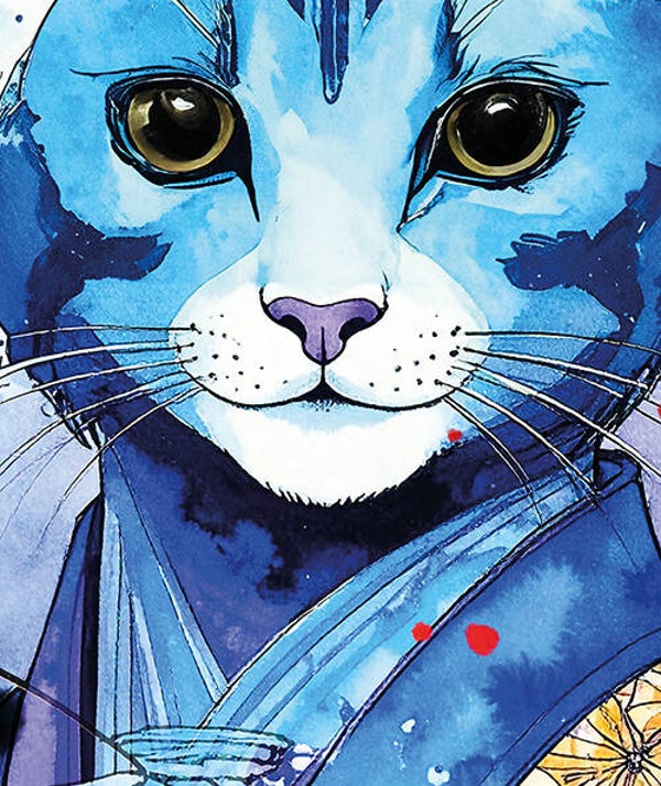 Aoitora (Blauwe Tijger) poseert triomfantelijk bij de visgraat. Niet ongeschonden, maar standvastig. Er hangt iets in de lucht: de nasleep van strijd, het stille moment na een laatste klauw. Zie de rode spatten. Geen bloederig tafereel, maar er is iets gebeurd. Een gevecht, misschien kort, maar onvermijdelijk. Niet uit woede, niet uit wreedheid — het ging zoals het moest gaan.